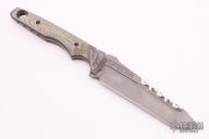This Airkat Apache by Dwaine Carrillo features a bead blast finished blade with sawteeth and a notched thumbrest, .175" blade stock and 1.355" blade depth, full tang construction. Hollow ground blade. The handle has silver twill scales with black screws. Excellent condition. The AirKat Apache is no longer in production by Dwaine Carrillo and they are highly sought-after. Comes with zippered case and original brown leather sheath.
