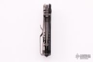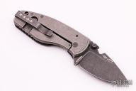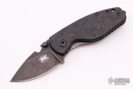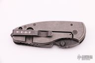 This HEAT/ F Plain Edge Framelock Folder has a black tumbled German Niolox stainless steel drop point blade with dual thumb studs, bottle opener, and a notched thumbrest. Handle is chard carbon fiber and gunmetal tumbled  titanium, with a black stainless steel tip up clip and removable glass breaker, lanyard hole. Excellent condition. Comes with original box.