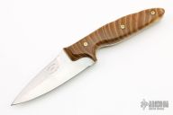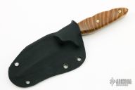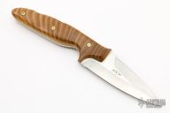 This Cypher by Chase Axinn features a satin finished double-edged blade with .125" blade stock and 1.404" blade depth, full tang construction. The handle has Tigerwood scales with mosaic pins. Comes with a kydex sheath. Has some light scratches, otherwise excellent condition.