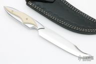 This knife is made from a Dendritic Cobalt blade supplied by David Boye and it was finished by Aaron Schwartz, it features a polished blade with .144" blade stock and 1.070" blade depth, full tang construction. The handle has aluminum scales with ivory paper micarta overlays. Comes with a black leather sheath and zippered case. Has some light scratches, otherwise excellent condition.