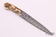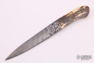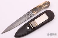 This Boot Dagger by Tommy Lee features a Damascus double-edged blade with .135" blade stock and .861" blade depth, full tapered tang construction. The handle has engraved and dovetailed stainless bolsters engraved by Stu Shaw, mammoth ivory scales with black liners. Comes with a black leather sheath with boot clip. Excellent condition.