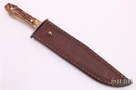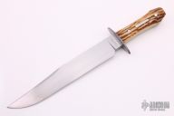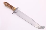This Gorgeous bowie by Master Smith Joe Flournoy features a hand rub satin finished blade with sharpened top edge, visible hamon line, .222" blade stock and 1.542" blade depth, hidden/mortise tang construction. The handle has a fileworked stainless steel guard, two piece stag grip with nickel silver escutcheon and spacer. Comes with a brown leather sheath and a zippered case. Excellent condition.