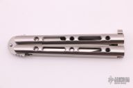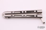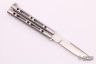 This balisong by 29 Knives features a satin finished blade with hollow ground swedge. The handle is composed of satin finished integral stainless steel. Excellent work. The blade has a few scratches from opening and closing on the handle and blade otherwise the knife is in excellent condition. Comes with COA and a padded zippered case. This knife was made before Chris Olofson started including a box.