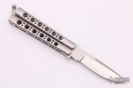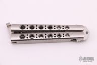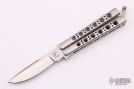 This balisong by 29 Knives features a satin finished blade with hollow ground swedge. The handle is composed of satin finished integral stainless steel. Excellent work. The blade has a few scratches from opening and closing on the handle and blade otherwise the knife is in excellent condition. Comes with COA, original box and a padded zippered case.