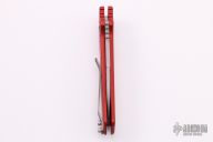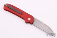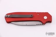This Wharncliffe coil spring automatic features a bead blast blade with notched thumbrest and red aluminum handle with red devil engraving, bead blasted titanium tip up clip. Numbered 165 on frame. Excellent Condition.