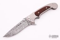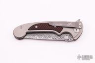 This Tighe One On Button Lock Flipper by Brian Tighe has a Damasteel drop point blade with raised thumb rest and dual thumb studs. Handle is bead blasted titanium with fluted snakewood inlays, and has a fileworked spine and belly. Bead blasted titanium tip down clip. Excellent action, lockup, and blade seating. Excellent condition. Comes with a zippered case.