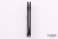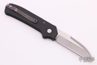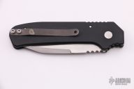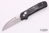 This Wharncliffe coil spring automatic features a bead blast blade with satin finished flats and a notched thumbrest.  The handle features black aluminum handle with flame engraving, bead blasted titanium tip up clip. Numbered 022 on frame. Has some light scuffing on frame otherwise excellent condition.