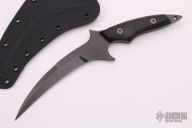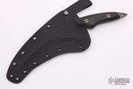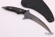 This Tactical Jaws is a Laci Szabo design and was produced by Robert Newton. It features a hawkbill black blade with notched thumbrest and sharpened top edge, .215" blade stock, 1" blade depth, full tang construction with black paper micarta scales. Comes with a kydex sheath. Excellent condition.