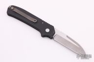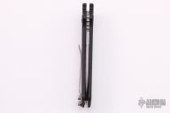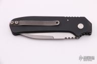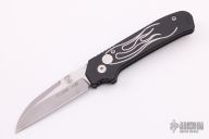 This Wharncliffe coil spring automatic features a bead blast blade with satin finished flats and a notched thumbrest.  The handle features black aluminum handle with flame engraving, bead blasted titanium tip up clip. Numbered 036 on frame. Scuffs and scratches are visible on the blade, handle and pocket clip.