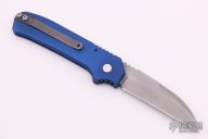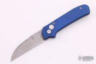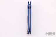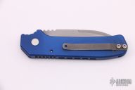 This Wharncliffe coil spring automatic features a bead blast blade with notched thumbrest and blue aluminum handle with a bead blasted titanium tip up clip. Numbered 158 on frame. Light scuffs are visible on the blade and frame otherwise the knife is in good condition.