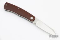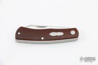 This Native Slipjoint by Jared Oeser features a hand rub satin finished blade with nail nick. The handle has vintage brown canvas micarta covers over white/black G-10 liners, stainless steel liners and spring. Comes with a velcro case and COA dated 6-1-17. Excellent condition.