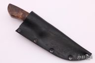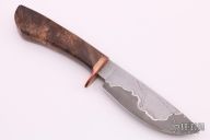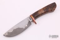 This Hunter by Dave Armour features a San Mai Damascus blade (mild steel, pure nickel, W2 core), .190" blade stock and 1.480" blade depth, hidden tang construction. The handle has a copper guard with a stabilized Illinois Walnut Crotch wood grip. Comes with a black leather sheath. New from maker.