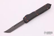This Ultratech Hellhound Tanto by Microtech features a Damascus blade, notched thumbrest and a nearly sharpened top edge. The handle is black aluminum with copper hardware, black stainless steel clip, has a carbon fiber top. Comes with original box and papers. Excellent condition. S/N 014 and dated 03/2017. Clip has the Anthony/Sean Marfione dagger logo.
