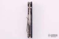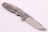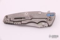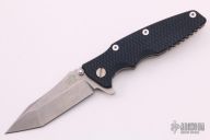 This Eklipse by Hinderer Knives features a stonewashed tanto blade with dual thumbstuds, flipper and notched thumbrest. The handle has a tumbled titanium frame and liner with a textured black/blue G-10 scale, titanium clip and hardware. Nice detent, lockup and blade seating. Comes with Hinderer box. Has a few light scratches, otherwise excellent condition.