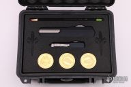 This Elite Continental Set by Marfione Custom Knives featured a Cypher and a UTX-70 in matching configuration. This Cypher has a stonewashed double-edged blade. The handle has a black aluminum frame with bead blasted stainless steel hardware and tip down clip. This knife is s/n 071 and dated 06/2019. Excellent condition. The UTX-70 has a stonewashed Spartan dagger blade. The handle has a black aluminum frame with bead blasted stainless steel hardware and tip down clip. This knife is s/n 071 and dated 06/2019. Excellent condition. Comes with original Pelican case with three coins and Dixon Ticonderoga #2 pencil. Comes with COA under the foam in the lid of the case.
