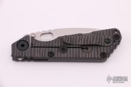 This MSC SNG framelock folder by Mick Strider features a stonewashed finished blade and a dimple pattern black/grey G-10 and flamed titanium frame and tip up titanium clip. Includes Hinderer "Lock Bar Stabilizer" for maximum reverse lock retention. Nice detent, lockup and blade seating. New condition.