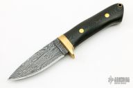 This hunter by Tom Cristel features a Turkish Twist Damascus blade (made by the maker) with .145" blade stock and 1.169" blade depth, full tapered tang construction. The handle has a brass guard and black/green linen micarta scales with red liners and brass pins. Comes with a leather sheath. New from maker.