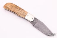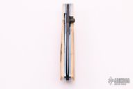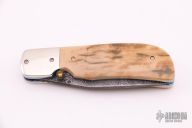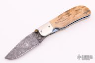 This Gentleman's Linerlock by Jake Elenbaas features a Alabama Damascus clip point blade with single thumbstud with jewel inset. The handle is comprised of nickel silver bolsters and mammoth scales over anodized titanium liners and a black G10 backspacer. Rides on bearings, nice detent, lockup and blade seating. Excellent condition.