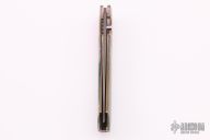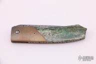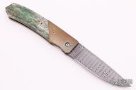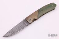 This linerlock folder by Craig Shelton features a stainless Damascus blade with single thumbstud with a green dyed bone inlay. The handle has mokume bolsters, and dyed Giraffe bone scales, anodized titanium liners with jeweled interiors, fileworked Damascus backspacer. Nice action, lock up and blade seating. Excellent Condition.
