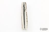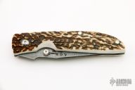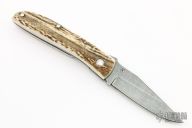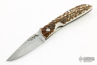This linerlock folder by AG Russell features a Damascus blade with single thumbstud. The handle has stag scales with stainless liners. Dated 2002. Excellent condition.
