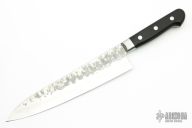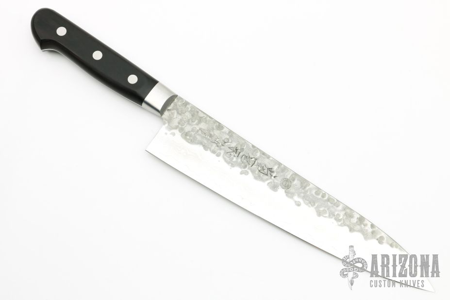 Similar in weight to many German knives, this WGAD series is popular among people who want a western handle and a Japanese blade. With its fine grain structure and great durability, VG10 is one of the best modern stainless blade steels. The hand hammered tsuchime finish helps release food from the blade and makes each knife unique. Hand engraved with the Kikuichi chrysanthemum logo. Comes with original box and papers. Has a couple light scratches, otherwise excellent condition.