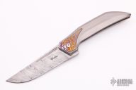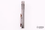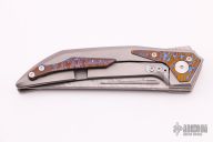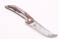 This Future model has a Damasteel blade and a titanium handle with a mokuti pocket clip and inlays. The Future represents the first ever integral folding knife from Reate Knives. This Bharucha designed flipper offers a 1 piece titanium handle for extreme strength and reliability. The Future is a massive folder with a 4.25" M390 blade, yet it remains slim and sleek for comfortable EDC. A mokuti pocket clip and inlays finish off the collectible design. Features: Integral handle made from a solid billet of titanium provides strength and durability. Bearing pivot disassembles easily for cleaning and maintaining the knife. M390 blade offers extreme sharpness and edge retention. Comes with original zippered case. Excellent condition.