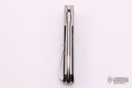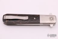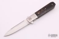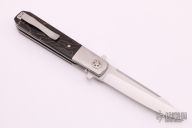 This knife by Eddie Baca features a satin finished blade with flipper and swedge, RWL-34 blade steel. The handle has orange peel finished titanium bolsters, liners, backspacer and tip up clip, Raffir "Noble" scales. Comes with zippered case and custom pivot tool. Excellent condition.