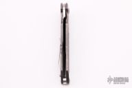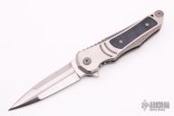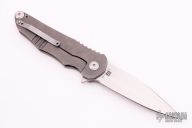 This Urban Dagger from Mikkel Willumsen features a chisel ground dagger style satin finished blade with a partially sharpened top edge and compound grinds. The handle is comprised of satin and tumble finished titanium with black G10 inlay on the presentation side. Stonewashed titanium tip up clip, aluminum standoff and lanyard hole in pommel. Great blade seating, detent and lock up. Knife flips well on IKBS. Has a few light scratches, otherwise excellent condition. Comes with original box.