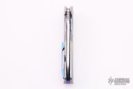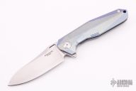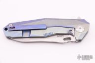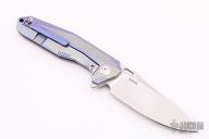 This knife by Rike Knife features a bead blasted blade with dual thumbhole, notched thumbrest and flipper. The handle has a stonewashed, anodized and milled titanium frame with matching tip up clip and backspacer, has stainless lockface insert. Nice detent, lockup and blade seating. Rides on caged bearings. Comes with nylon zippered case. #018on blade. Has a couple light scratches, otherwise excellent condition.