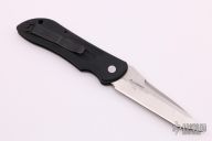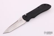 This 9100 Stryker Automatic from Benchmade features a satin finished tanto style blade with swedge and notched thumb ramp. The handle is comprised of machined and black anodized handle with lanyard hole in pommel. Black coated stainless steel tip up clip. Sliding safety on handle spine. Includes original box and papers. Excellent condition. First Production Run 1998