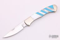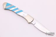 This Buck 532 features a mirror finished blade with nail nick and fileworked spine. The handle has a nickel silver frame with mother of pearl/nickel silver/turquoise inlays and a fileworked stainless steel spring. Comes with original box and papers.  Excellent Condition.  COA is #076 of 100