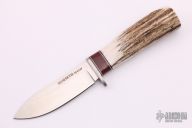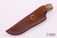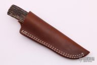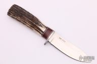 This Model 15 by Morseth Knives features a satin finished blade with .121" blade stock and 1" blade depth, hidden tang construction. The handle has a stainless steel guard, stag grip with black/red/white/red linen micarta spacer pattern. Comes with a brown leather sheath. Excellent condition. Dated 2012