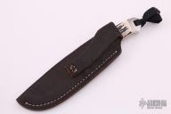 This integral Drop Point Hunter from Dietmar Kressler features a drop point hand rubbed satin finish blade with a checkered thumbrest, .166" blade stock and .990" blade depth. The handle has integral fluted bolsters and beautiful stag scales with red liners and a tapered tang. Comes with a brown leather sheath with belt loop. Excellent condition. A beautiful piece.