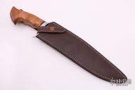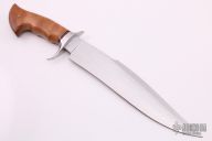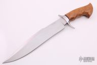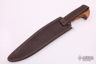 This Bowie by Andre Ronald features a satin finished clip point blade with false top edge, .190" blade stock and 1.942" blade depth, hidden tang construction. The handle has a steel guard, olive wood grip with red/black spacers. Comes with a brown leather sheath with belt loop. New from maker. Comes with COA dated April 2nd, 2019.