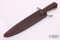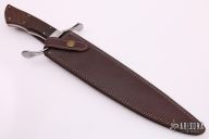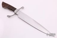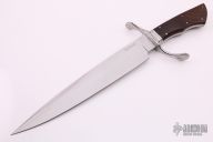 This Bowie by Andre Ronald features a satin finished blade with false top edge, .203" blade stock and 1.748" blade depth, hidden/frame/mortise tang construction. The handle has a steel guard, walnut wood  scales with brass pins and a steel frame. Comes with a brown leather sheath with belt loop. New from maker. Comes with COA dated April 1st, 2019.