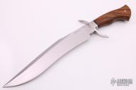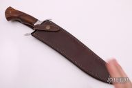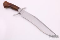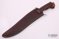 This Bowie by Andre Ronald features a satin finished clip point blade with false top edge, .211" blade stock and 2.058" blade depth, hidden tang construction. The handle has a steel guard, walnut grip with red/black spacers. Comes with a brown leather sheath with belt loop. New from maker. Comes with COA dated April 6th, 2019.