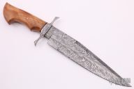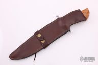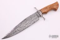 This Bowie Fighter by Andre Ronald features a Feather Damascus clip point blade with false top edge, .178" blade stock and 2.038" blade depth, hidden frame tang construction. The handle has an engraved steel guard, olive wood grip with red/black spacers, brass pin. Comes with a brown leather sheath with belt loop. New from maker. Comes with COA dated April 11th, 2019.