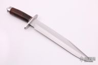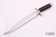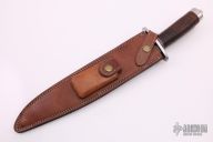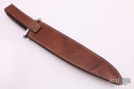 This Bowie by Andre Ronald features a satin finished clip point blade with false top edge, .194" blade stock and 1.590" blade depth, hidden tang construction. The handle has a stainless steel guard, stacked leather grip with red/black/white spacers. Comes with a brown leather sheath with belt loop. New from maker. Comes with COA dated April 4th, 2019.