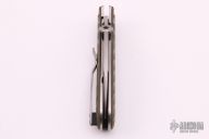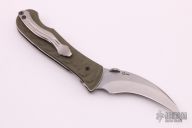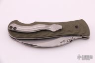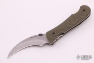 This Elvia Folder by Korth Cutlery features a stonewashed hawkbill blade with thumbdisc. The handle has green G-10 scales and backspacer, orange peel finished titanium liners and a tip up titanium clip. Comes with a velcro case. Rides on IKBS, nice detent, lockup and blade seating. New from maker.
