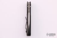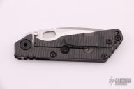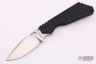 This Mick Strider SNG Fatty framelock folder features a stonewashed blade with thumbhole and notched thumbrest. The handle has a black aluminum and flamed titanium frame with titanium clip, tip up carry. Jimping on blade spine. Nice lockup, detent, and blade seating. New from maker.