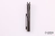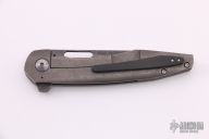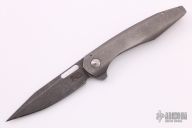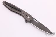 This knife by Nova Blades features a acid etched tumble finished blade with false top edge, thumbhole and flipper. The handle has a tumble finished titanium frame with a two-tone tip up clip and a satin titanium backspacer. Rides on bearing, nice detent, lockup and blade seating. Has a few light scuffs, otherwise excellent condition.