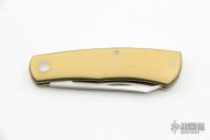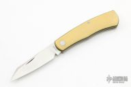 This Native Slipjoint by Jared Oeser features a satin finished blade with nail nick. The handle has yellow paper micarta covers over green and red G-10 liners, stainless steel liners and spring. Comes with original box, handkerchief and COA dated 9-6-18. Excellent condition.