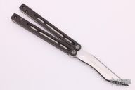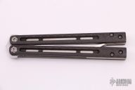 This Custom Lyra balisong is marked #1 inside the backspacer and it looks like it says "Jewell" in cursive in the other backspacer. It features a satin finished tanto recurve blade with false top edge. The handle has carbon fiber scales with titanium liners and backspacer. Has a few light scratches, otherwise excellent condition. Comes with a plastic vault style case.