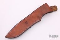 This knife by Paul LeBatard features a clip point blade with false top edge made from a Black Diamond file, .288" blade stock and 1.231" blade depth, hidden tang construction. The handle has a copper double guard, stag grip with copper butt, black/red/copper spacers. Comes with a brown leather sheath. Has some patina and light scratches, otherwise excellent condition.