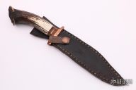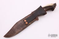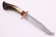 This Fighter by Bluff Creek Forge features a hand forged satin finished blade with .158" blade stock and 1.300" blade depth, hidden tang construction. The handle has a hammered copper guard, black/copper/paper micarta spacers and a crown stag grip with copper pin. Comes with a hand tooled black leather sheath. Has some light scratches, otherwise excellent condition.