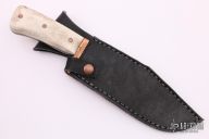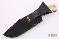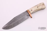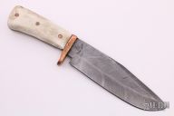 This Bowie by Bluff Creek Forge features a feature Damascus blade with .220" blade stock and 1.996" blade depth, full tang construction. The handle has a hammered copper guard with Pere David Deer antler scales and copper pins. Comes with a hand tooled black leather sheath. Has some patina and is a little rough, otherwise good condition for what it is.