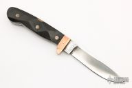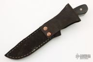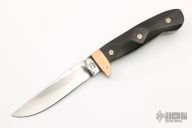 This Hunter by Bluff Creek Forge features a satin finished blade with .181" blade stock and .976" blade depth, full tapered tang construction. The handle has copper bolsters, African Blackwood scales with mosaic pins. Comes with a hand tooled black leather sheath. Has some patina and is a little rough, otherwise good condition for what it is.