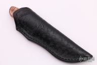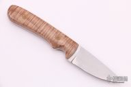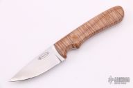 This Utility by Robb Gray features a hand rub satin finished blade with .094" blade stock and .952" blade depth, full tang construction. The handle has curly maple scales with red liners and engraved copper pins. Comes with a hand tooled black leather sheath and a zippered case. Excellent condition.