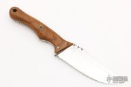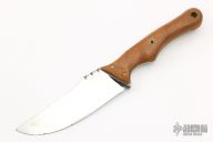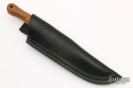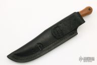 This Side Carry by Josh Gernigliaro features a mirror polished blade with acid etched pattern (almost looks like an alligator head), fileworked thumbrest, .166" blade stock and 1.221" blade depth, full tang construction. The handle has wood scales with brass and mosaic pins, fileworked tang. Comes with a black leather sheath and zippered case. has some light scratches, otherwise good condition.