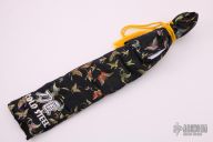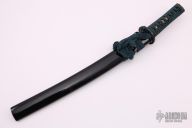 Most noticeable are the distinctive teal-green silk cord-wrap and black samé (ray skin) used on the handles and the black iron furniture that bears the dragonfly motif. Also, the polished blades are more strongly curved than our Imperial blades and terminate in a long "iris leaf" point for maximum cutting and slashing potential. Additionally, these swords come with two protective bags. Includes a blue cotton travel bag and an intricately decorative display bag made from fine heavy silk brocade.
